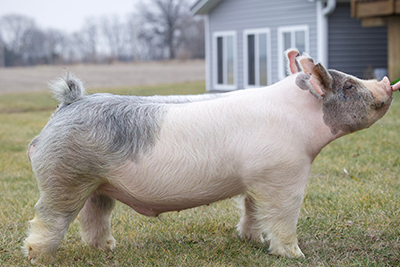 BLUCIFER is a robust blue boar with a tremendously unique look from front to rear. You want to talk about one that has gigantic legs with huge toes and it matches his wide, massive back and muscular square hip. Blucifer’s chest is busted wide open with a cocky, cool fronted head and neck. The mother is a Bobell gilt and the mother’s mother came from Heimer. We would like to extend a huge thank you to the Todd Morris Family for getting this boar to Chariton, IA.