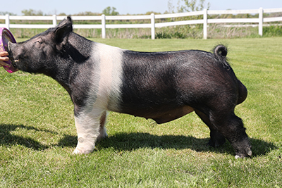 If you need one that has a high head carriage that reads stout in his feature and bone work, look no further than SHIFTING GEARS. This thing is big legged, huge feet, and as athletic as you can make one. He has a big wide shapely back that is needed in the show ring. Look for this guy’s pigs to shift gears and head to pen 1.